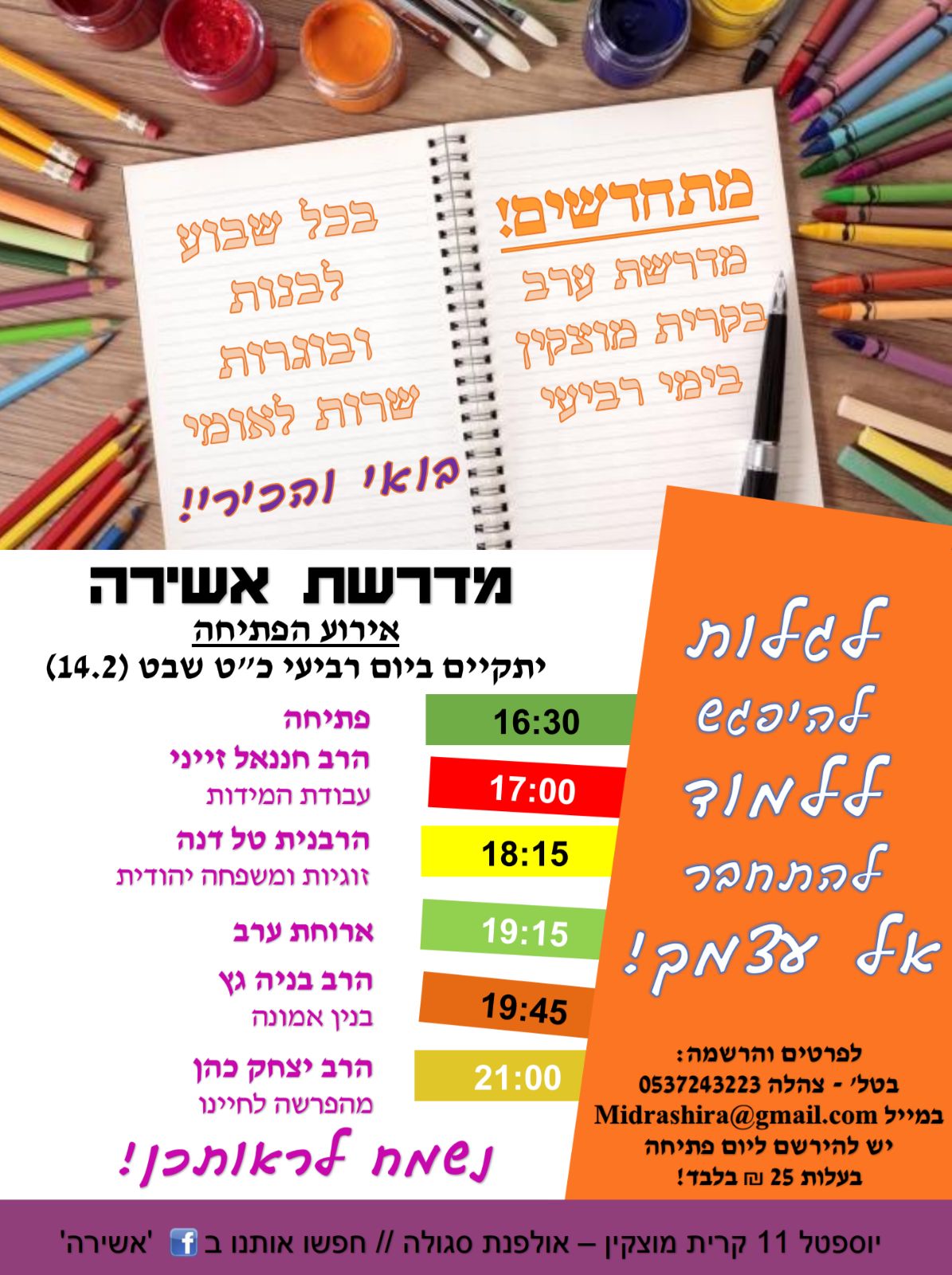 "נכון לעכשיו המדרשה תפעל ערב אחד בלבד בשבוע אך יש כוונה בהמשך לבנות שירצו לעבור לשני ערבים בשבוע. אנו מתחילות עכשיו בפרסום המדרשה גם בחוץ באופן נרחב ומאמינות שיגיעו ויהיו שותפות במדרשה עשרות בנות."