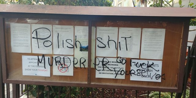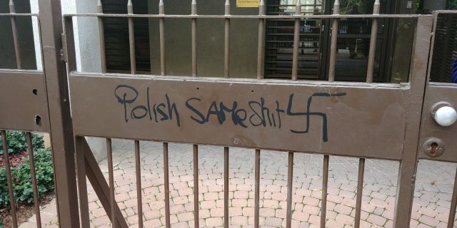 תגובה לאנטישמיות: אלמונים ריססו כתובות נאצה וצלבי קרס על שער הכניסה של מתחם שגרירות פולין ישראל ברחוב סוטין תל אביב, וכן על לוחות מודעות הממוקמים בסמוך לבניין השגרירות. הכתובות רוססו בעברית ובפולנית, וכללו בין השאר כתובות שאמרו "רוצחים פולנים". המשטרה הודיעה כי פתחה בחקירת האירוע, והחלה באיסוף עדויות על מנת לאתר את מרססי הכתובות.
