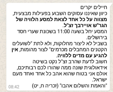 "כיוון שאיננו עסוקים השבוע בפעילות מבצעית, מצווה על כל אחד לצאת למסע ההלוויה של הרב שמואל אוירבך", כתב הרב שאול עבדיאל לחייליו. לדבריו, "בשביל לא ליצור מחלוקות ולא לתת ל'שועלים הקטנים המחבלים מכרמים' לצור מהומות, אין להגיע עם מדים ללוויה.