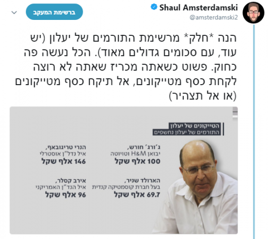 ראש הדסק הכלכלי והפרשן לענייני כלכלה של תאגיד השידור הישראלי, העיתונאי שאול אמסטרדמסקי, חושף הערב (ראשון) רשימה קצרה של חלק מהתורמים למפלגתו החדשה של משה בוגי יעלון.