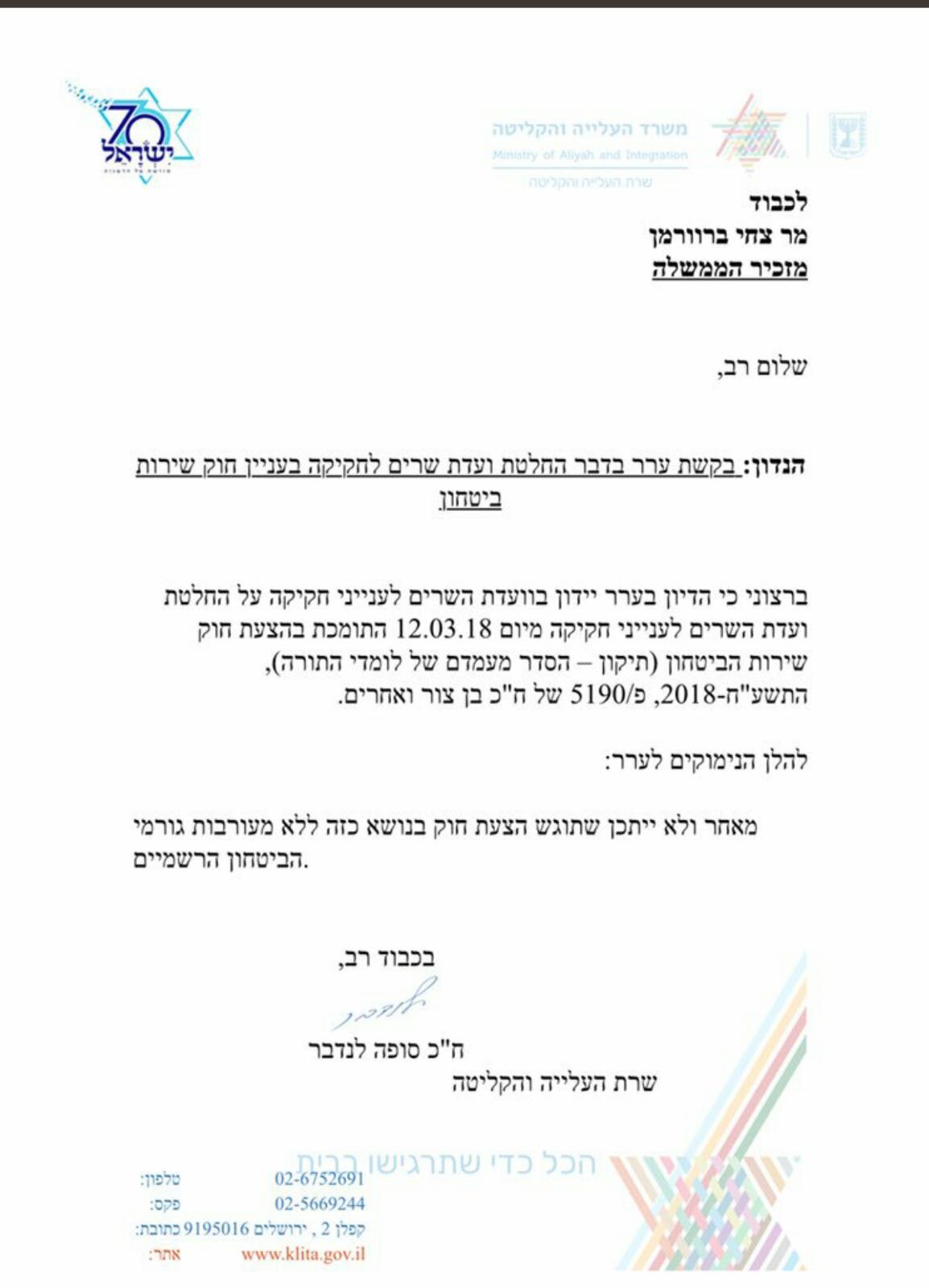 שרת הקליטה סופה לנדבר הגישה ערר על החלטת ועדת השרים לחקיקה לאשר את חוק הגיוס של ח"כ יואב בן צור מש"ס. מוקדם יותר הבוקר אישרה הועדה ברוב של 2 תומכים (שקד ואזולאי) מול מתנגדת אחת (לנדבר) את הצעת החוק תוך הסתייגות כי החוק יעבור בקריאה טרומית ובלבד והמשך החקיקה ייעשה בתיאום עם משרד הביטחון ועם היועץ המשפטי לממשלה אביחי מנדלבליט.