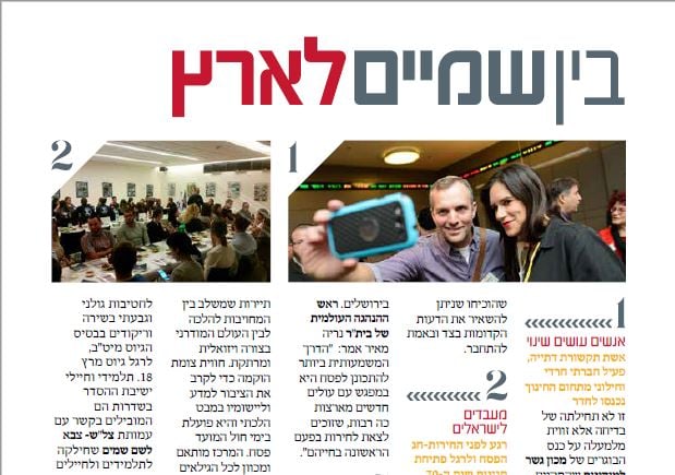שינוי נוסף שנעשה ברמת התוכן, ובטוח לא היה מקבל את אישורה של ההנהלה הקודמת הוא הכנסת מדור "בין שמיים לארץ" שהוא למעשה שני עמודי תוכן שיווקי המוצג כעמודי ברנז'ה ובהם פירוט של מי היה איפה באירועי המגזר (בדומה לעיתונים מצב הרוח ושביעי), אגב רוב האירועים במדור הם של לקוחות משרד היח"צ גל-אורן-לרנר.