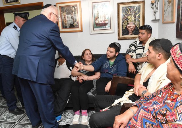 ריבלין אמר לבני המשפחה: ״אנחנו בארץ שלנו כבר מאות שנים. איזו מדינה בנינו, איזו ארץ בנינו, איזו תעשייה וחברה בנינו. הכאב הוא גדול, אני יודע, וכל משפחה היא עולם ומלואו".