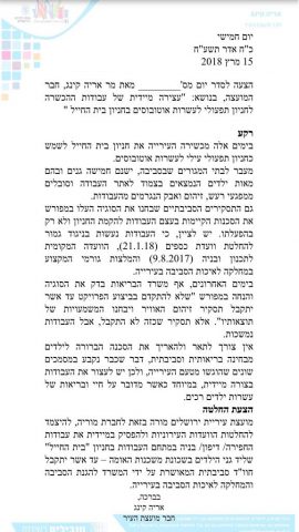 בימים האחרונים אף הגיעה הנחיה ממשרד הבריאות לעירייה ובה נכתב שלא להתקדם עם העבודות עד אשר יתקבל תסקיר זיהום אוויר בסביבה, תסקיר כזה לא התקבל והעבודות נמשכות".
