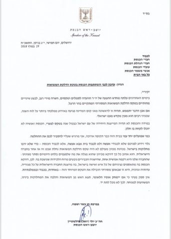 יו״ר הכנסת יולי אדלשטיין שיגר היום (חמישי) לח״כים, ולכלל עובדי הכנסת מכתב חריף בו הודיע להם, כי לראשונה מאז קום המדינה הכנסת ועובדיה לא יקחו השנה חלק פעיל בטקס הדלקת המשואות, זאת סביב המחלוקת החריפה שפרצה בינו לבין ראש הממשלה נתניהו סביב נאומו של האחרון.
