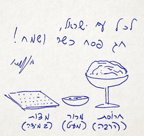 נתניהו, הידוע בכשרון הציור בו ניחן המשיך את המגמה מ'נאום החרוסת' שנשא בתחילת השבוע וצייר חרוסת, מרור ומצות, כשהוא מציע את הכמות הרצויה לאכול מכל אחד מהשלושה.