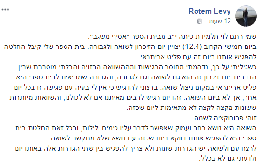 רותם לוי, תלמידת כיתה יב' בבית הספר 'אסיף משגב' שבמועצה האיזורית 'משגב', פרסמה פוסט בעמוד הפייסבוק שלה ובו היא טוענת כי לרגל יום השואה שחל היום (חמישי), בית הספר בו היא לומדת החליט להפגיש את התלמידים עם פליט אריתראי.
