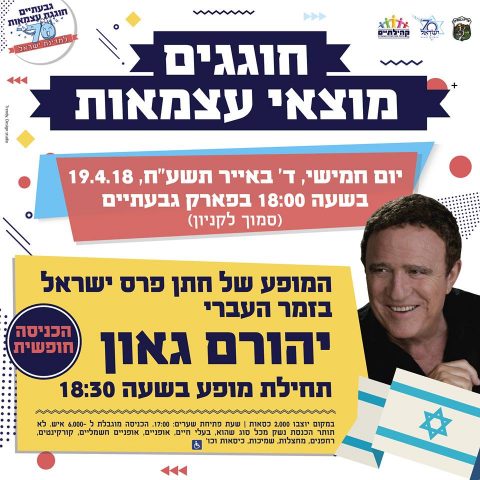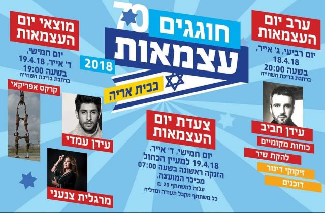 יום רביעי, 18/4/18, ערב יום העצמאות – מתחם גן החמישה, החל מהשעה 20:00 יופיעו: חנן בן ארי (בבמה הדתית- במתחם השוק) דודו אהרון, "האולטראס" וספיר סבן. מופע לילדים: "הבאגיס"