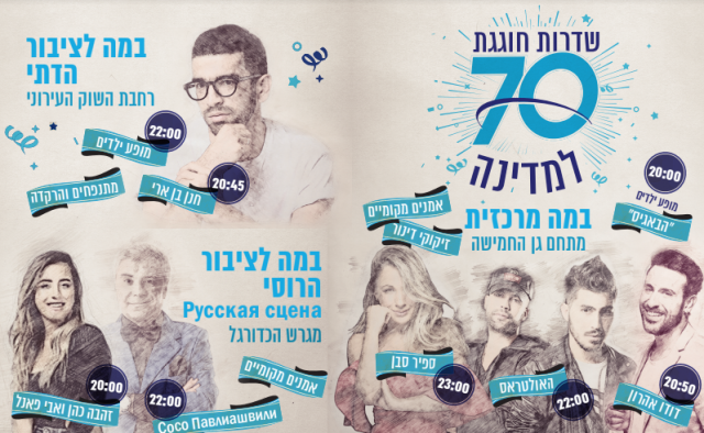 חותמים 70 שעות של חגיגות עצמאות במופע הצדעה ייחודי ליוצרים, למבצעים ולשירים הגדולים במהלך 70 שנות קיומה של מדינה ישראל עם מיטב האמנים הגדולים במדינה, ביניהם: שולי רנד, יובל דיין, אייל גולן, מירי מסיקה, שרית חדד, גידי גוב ועוד.