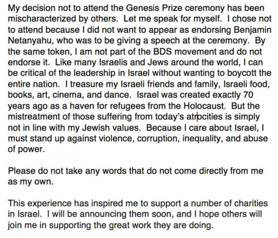 "ההחלטה שלי לא להגיע ולקבל את פרס 'בראשית' פורשה בצורה לא נכונה על ידי אחרים. תנו לי לדבר בעצמי", כתבה פורטמן בהודעה "בחרתי שלא להגיע בגלל שלא רציתי להצטייר כמי שמביעה תמיכה בבנימין נתניהו, שהיה אמור לנאום בטקס. יחד עם זאת, אני לא תומכת בארגון ה-BDS ואני לא חלק מהארגון".