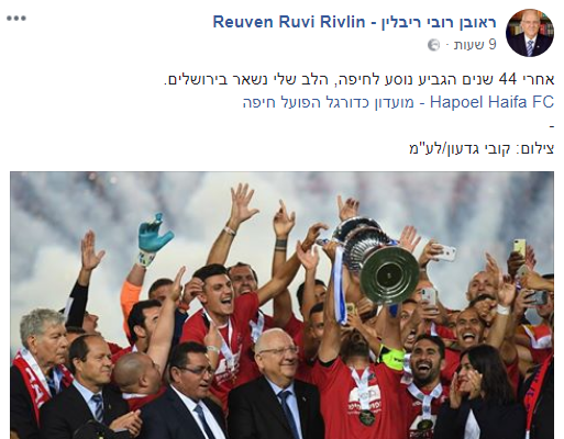 אמש (רביעי), מספר דקות אחרי הזכייה של הפועל חיפה בגביע המדינה בכדורגל, פורסם בדף הפייסבוק של נשיא המדינה, ראובן רובי ריבלין, תמונה של הנשיא עם שחקני הפועל חיפה כשהם מניפים את הגביע.