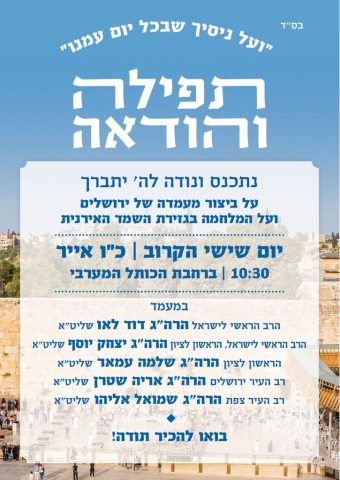 במעמד הרבנים הראשים לישראל יתכנסו מחר (שישי) מאות תלמידי החמ"ד עם אלפים מעם ישראל ויערכו תפילת הודיה בכותל המערבי על ביטול הסכם הגרעין עם איראן. מאות אלפי תלמידי החינוך הממלכתי דתי יצטרפו אף הם לתפילה, שתשודר בשידור חי לאלפי מוסדות חינוך בארץ ובעולם.
