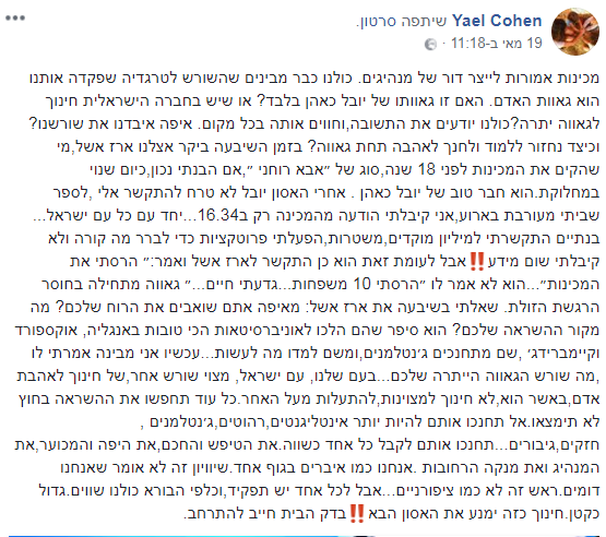 יעל כהן, אמה של הנערה רומי כהן ז"ל שנספתה באסון השטפון בטיול של המכינה הקדם צבאית 'בני ציון', מפנה אצבע מאשימה כלפי ראש המכינה, יובל כהאן, על כך שלא טרח לעדכן אותה בזמן אמת.