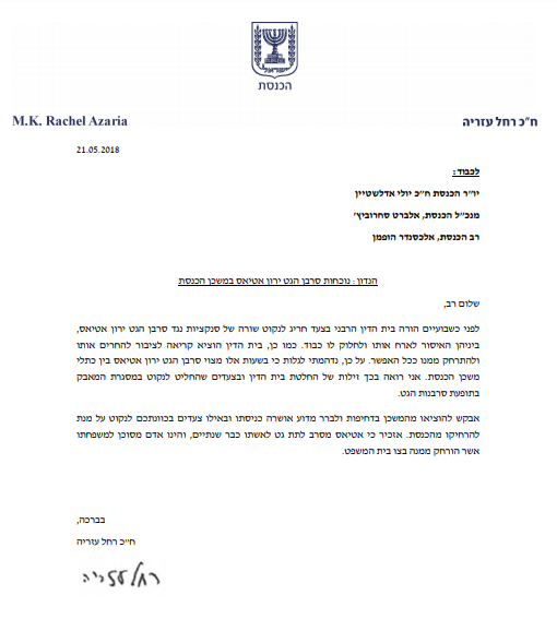 חברת הכנסת רחל עזריה (כולנו), שיגרה ליו"ר הכנסת יולי אדלשטיין מכתב בהול ובו היא מבקשת להרחיק את סרבן הגט ירון אטיאס ממשכן הכנסת.