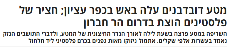 אתר 'הארץ' דיווח הבוקר (רביעי) על אירוע הצתת מטעי הענק בגוש עציון שבוע בלבד לפני פסטיבל הדובדבנים הגדול הנערך בכפר עציון. באותה כתבה, הייתה התייחסות גם לשריפת חציר של 'פלסטינים' באזור חרבאת דיראת שבדרום הר חברון. בנוסף, דווח על נזק שנגרם אתמול למאות גפנים בכפר 'פלסטיני' סמוך לעיירה חלחול.