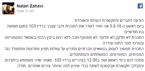 תחת הכותרת 'הודעה לחברים ולתקשורת העוינת והאוהדת', כתב זהבי: "ביום ראשון ה-3.6.18 אני חוזר לשדר את התכנית 'זהבי עצבני 'ברדיו 103FM בתום חופשה בת חודשיים".