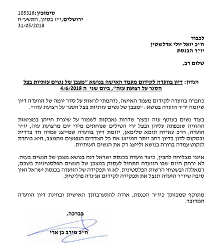 חברת הכנסת מירב בן ארי (כולנו), חברת הוועדה לקידום מעמד האישה, שיגרה לפני זמן קצר (חמישי) מכתב חריף ליו"ר הכנסת, יולי אדלשטיין, במחאה על קיום דיון בוועדה לקידום מעמד האישה בנושא מצבן של הנשים בעזה.