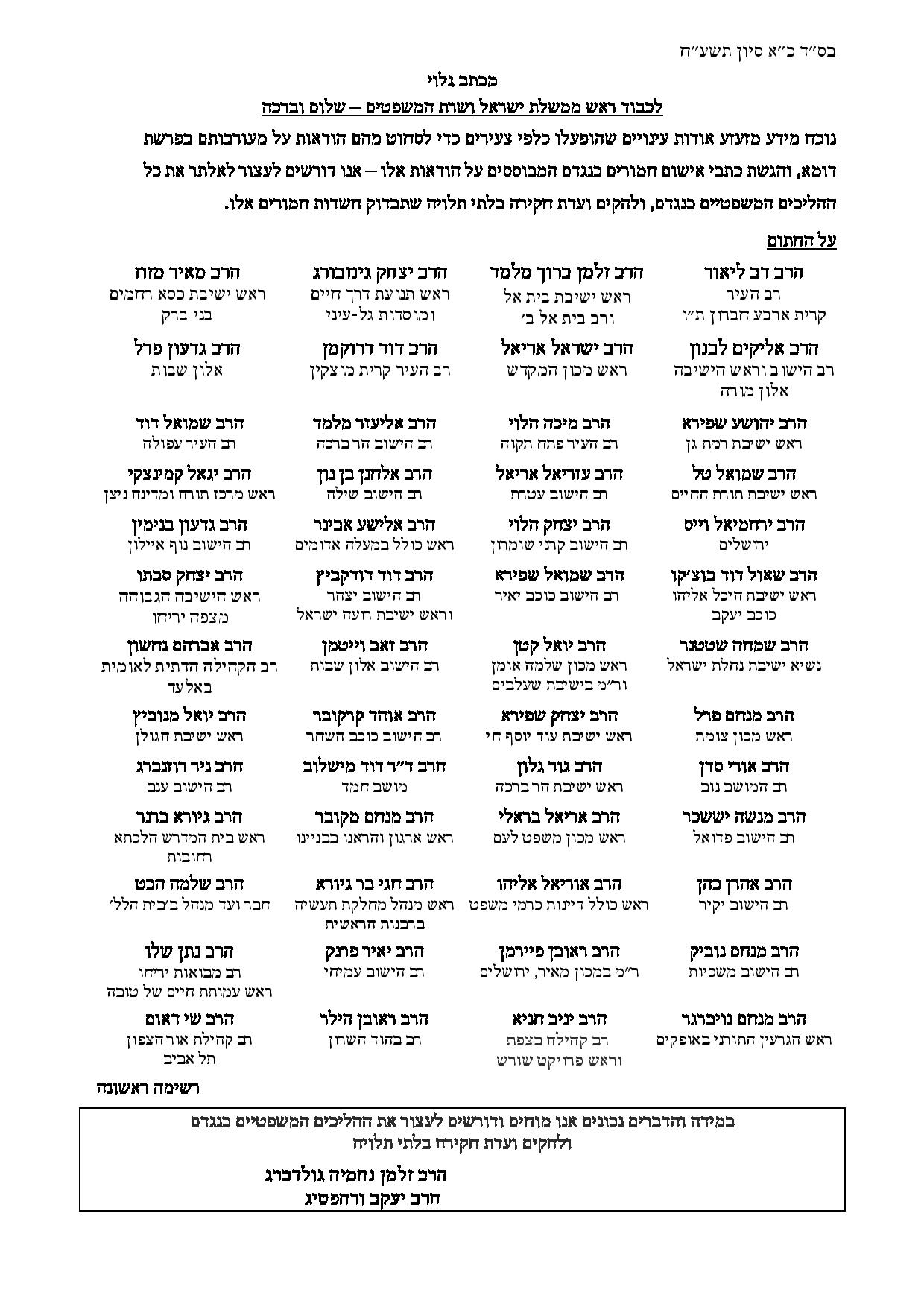 "לכבוד ראש ממשלת ישראל ושרת המשפטים – שלום וברכה, נוכח מידע מזעזע אודות עינויים שהופעלו כלפי צעירים כדי לסחוט מהם הודאות על מעורבותם בפרשת דומא, והגשת כתבי אישום חמורים כנגדם המבוססים על הודאות אלו – אנו דורשים לעצור לאלתר את כל ההליכים המשפטיים כנגדם, ולהקים ועדת חקירה בלתי תלויה שתבדוק חשדות חמורים אלו." כתבו הרבנים לנתניהו ושקד.