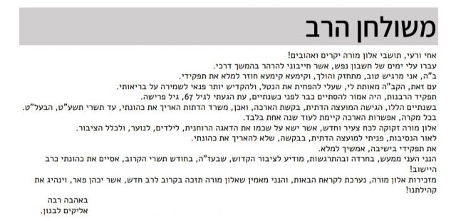 "אחיי ורעי תושבי אלון מורה היקרים והאהובים", כתב הרב לבנון לתושבי היישוב.