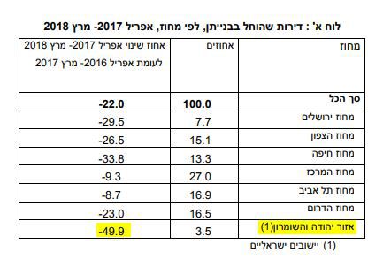 אלא שנתוני הלמ"ס מציגים ירידה של 50% בהתחלות הבנייה ביו"ש בשנה האחרונה ביחס לשנה שקדמה לה – נזכיר תקופת כהונתו של דונלד טראמפ בנשיאות ארה"ב, לעומת שלהי כהונתו של ברק אובמה. בסך הכל הממוצע הארצי עומד על ירידה של 22% בהתחלות הבנייה, אך מול הירידה הדרסטית בבנייה ביו"ש, יש ירידה של שליש בחיפה וכרבע בצפון ובירושלים – שגם היא סובלת מהקפאת בנייה.