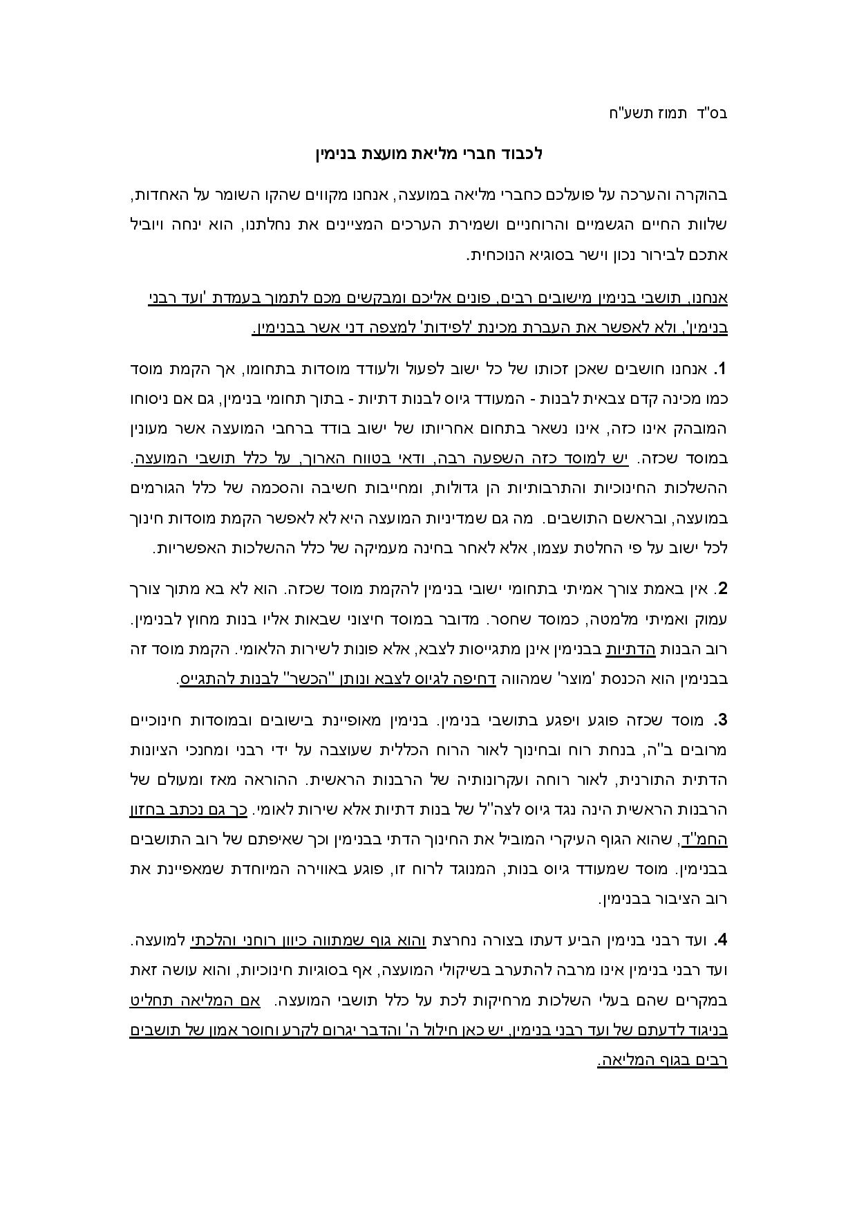 לאורך המכתב, ב8 סעיפים, מפרטים, לטענתם, מדוע הקמת המכינה היא מעשה חמור העלול לפגוע בכל תושבי המועצה: "הקמת מוסד כמו מכינה קדם צבאית לבנות – המעודד גיוס לבנות דתיות – בתוך תחומי בנימין, גם אם ניסוחו המובהק אינו כזה, אינו נשאר בתחום אחריותו של ישוב בודד ברחבי המועצה אשר מעוניין במוסד שכזה. יש למוסד כזה השפעה רבה, ודאי בטווח הארוך, על כלל תושבי המועצה".