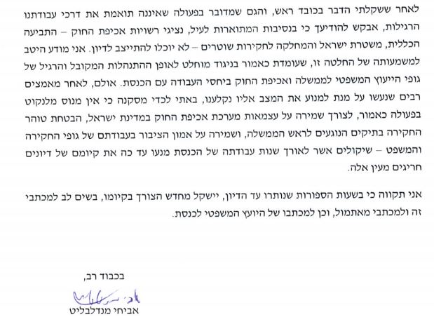 בתגובה, מנדלבליט שיגר מכתב ליועץ המשפטי של הכנסת אייל ינון בו קרא לו לבטל את הדיון, מפני שלדבריו המטרה של קיש עלולה לפגוע בשלטון החוק ולחבל בחקירת המשטרה המתנהלת בנושא, אך קיש הודיע לו כי הוא מתכוון להתעלם מחוות דעתו.