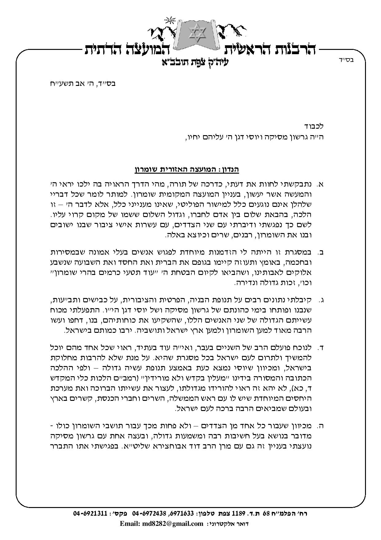 "אשר על כן", סיכם הרב אליהו, "אני מצטרף להמלצתו של הרב אליקים לבנון שליט"א ואפעל במסגרת זו למצוא את המישור הנכון שבו גרשון ימשיך לפעול לטובת עם ישראל בשומרון או בכל מקום אחר".