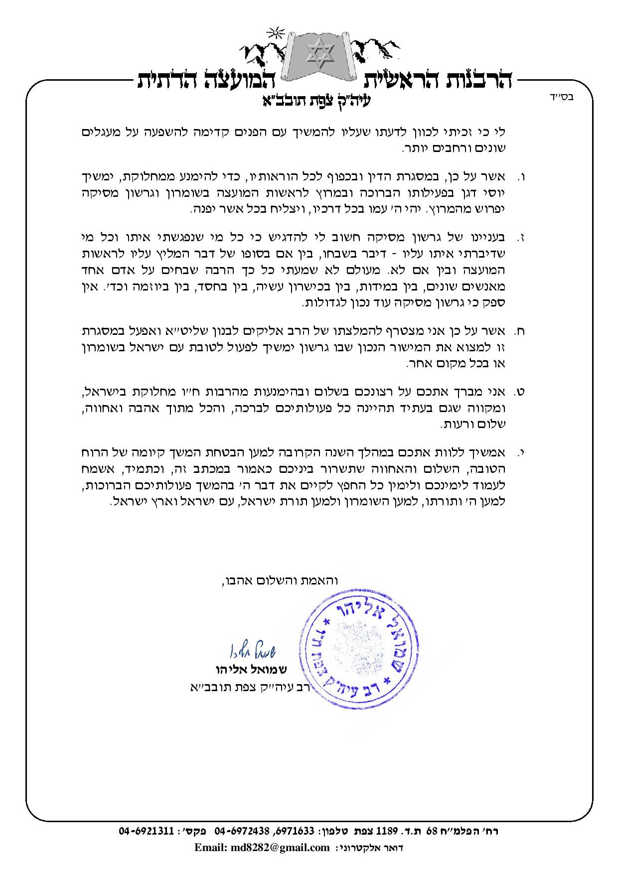 "אשר על כן", סיכם הרב אליהו, "אני מצטרף להמלצתו של הרב אליקים לבנון שליט"א ואפעל במסגרת זו למצוא את המישור הנכון שבו גרשון ימשיך לפעול לטובת עם ישראל בשומרון או בכל מקום אחר".