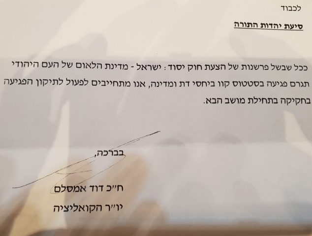 רגע דרמטי נרשם לפני ההצבעה, כי בשל החרפת התנגדות החרדים לסעיף בחוק, התחייב יו"ר הקואליציה דודי אמסלם בפני סיעת יהדות התורה כי אם חוק הלאום יפגע באינטרסים החרדיים הוא ישונה במושב הכנסת הבא.