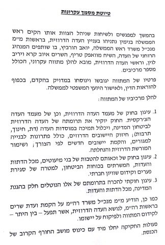לפיו, מעמדם של הדרוזים יעוגן בחוק, שם תוכר תרומתם למדינה ולצה"ל ויכלול תמיכה במוסדות החינוך והדת של העדה. בנוסף, חיזוק היישובים הדרוזים, כולל פתרונות לבנייה למגורים, והקמת יישובים חדשים לפי הצורך