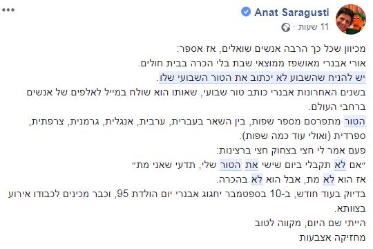 סרגוסטי סיפרה כי "פעם אמר לי חצי בצחוק חצי ברצינות: 'אם לא תקבלי ביום שישי את הטור שלי, תדעי שאני מת'. אז הוא לא מת, אבל הוא לא בהכרה. בדיוק בעוד חודש, ב-10 בספטמבר יחגוג אבנרי יום הולדת 95, וכבר מכינים לכבודו אירוע בצוותא. הייתי שם היום, מקווה לטוב. מחזיקה אצבעות".