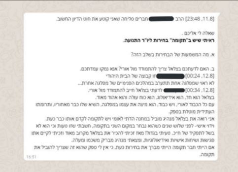בתחילה, רב בציונות הדתית מעלה את השאלה סביב הבחירות ליו"ר התנועה ב"תקומה" (האיחוד לאומי, ע"ג) ושאל את חברי הקבוצה: "מה המשמעות של הבחירות בשלב הזה, ובנוסף, האם לדעתכם בצלאל צריך להתמודד מול אורי? אנא נמקו עמדתכם", כתב.