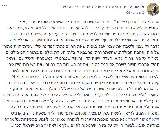 בסוף דבריו כותב אזריה: "במהלך 26 חודשים ספגתי הרבה כאב, אכזבה והמון סכינים בגב שסובבו אותם בלי הרף, לצערי קיבלתי היום עוד אחד ובנוסף קיבלתי גם יריקה בפנים. באמת שלא האמנתי אחרי הכל שיגידו עליי משהו כזה אחרי כל מה שנתתי וספגתי למען ביטחון המדינה באמת שזה כואב ומכביד וקורע אותי מבפנים ולמרות כל הפוסט הארוך הזה אשוב ואגיד למרות הכל: אין לי ארץ אחרת".