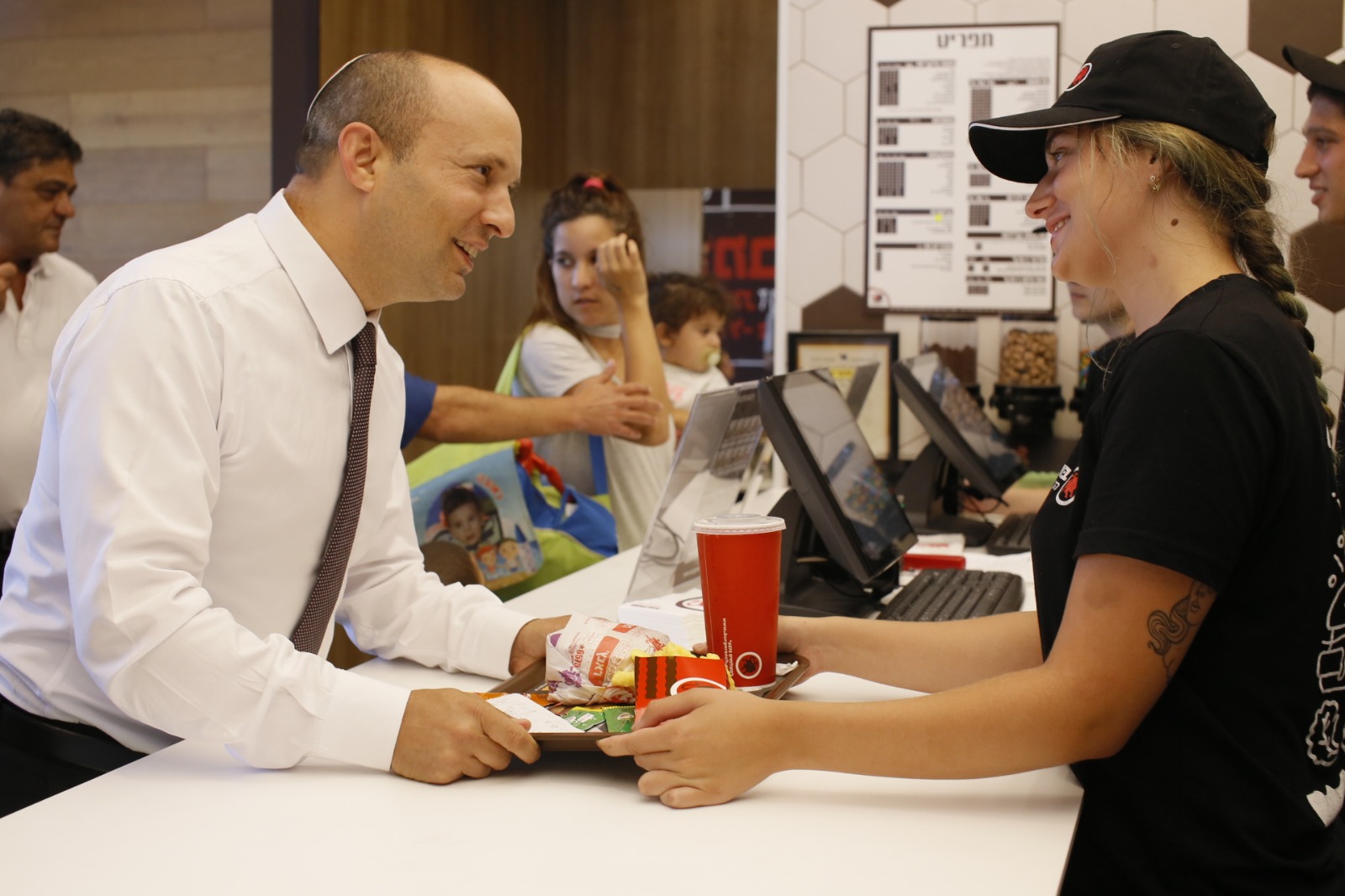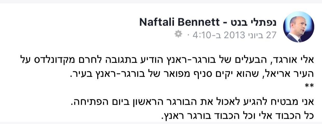 עתה, חמש שנים אחרי, מימש בנט את הבטחתו, כאשר הגיע אתמול לעיר אריאל ואכל את הבורגר הראשון בסניף החדש.