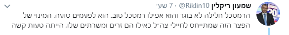 גולש אחר כתב: "ריקלין, אם כפי שאתה מתאר הרמטכ"ל הוא ממש בוגד המסייע לאויב- איך אתה שותק לראש הממשלה שמגבה אותו ומשאיר אותו בתפקיד? ואם ההאשמות שלך על הרמטכ"ל הן סתם אמירה חסרת בסיס במציאות- האם אתה לא חושש משנאת החינם שדבריך יגרמו? אתה לא חושש מאחריותך לדם שישפך לבסוף?".
