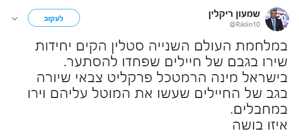 בחשבון הטוויטר שלו פרסם ריקלין ציוץ ממנו נראה כאילו הוא משווה את איזנקוט לסטלין: "במלחמת העולם השנייה סטלין הקים יחידות שירו בגבם של חיילים שפחדו להסתער. בישראל מינה הרמטכ"ל פרקליט צבאי שיורה בגב של החיילים שעשו את המוטל עליהם וירו במחבלים. איזו בושה".