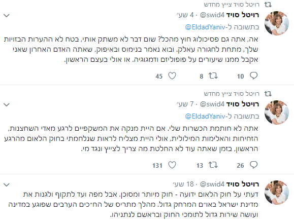 חברת הכנסת רויטל סוויד מהמחנה הציוני, פרסמה בחשבון הטוויטר שלה ציוץ המגנה את הצעד של חברי הכנסת הערבים המקדמים באו"ם מהלך של גינוי מדינת ישראל בעקבות חוק הלאום. מי שגינה את דבריה הוא פעיל השמאל אלדד יניב שתקף את סוויד אישית ולא ציפה שהיא תחטיף לו בחזרה.