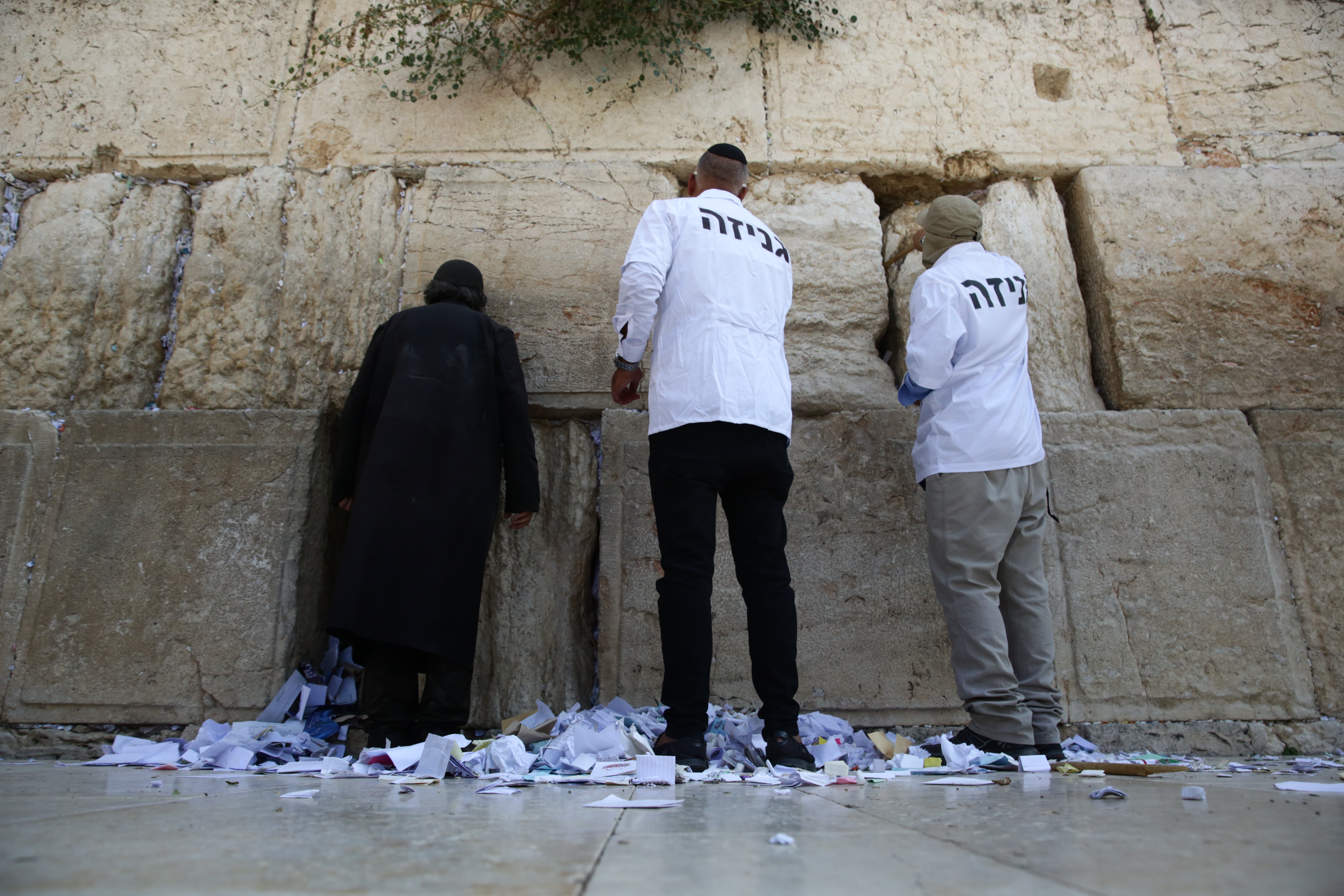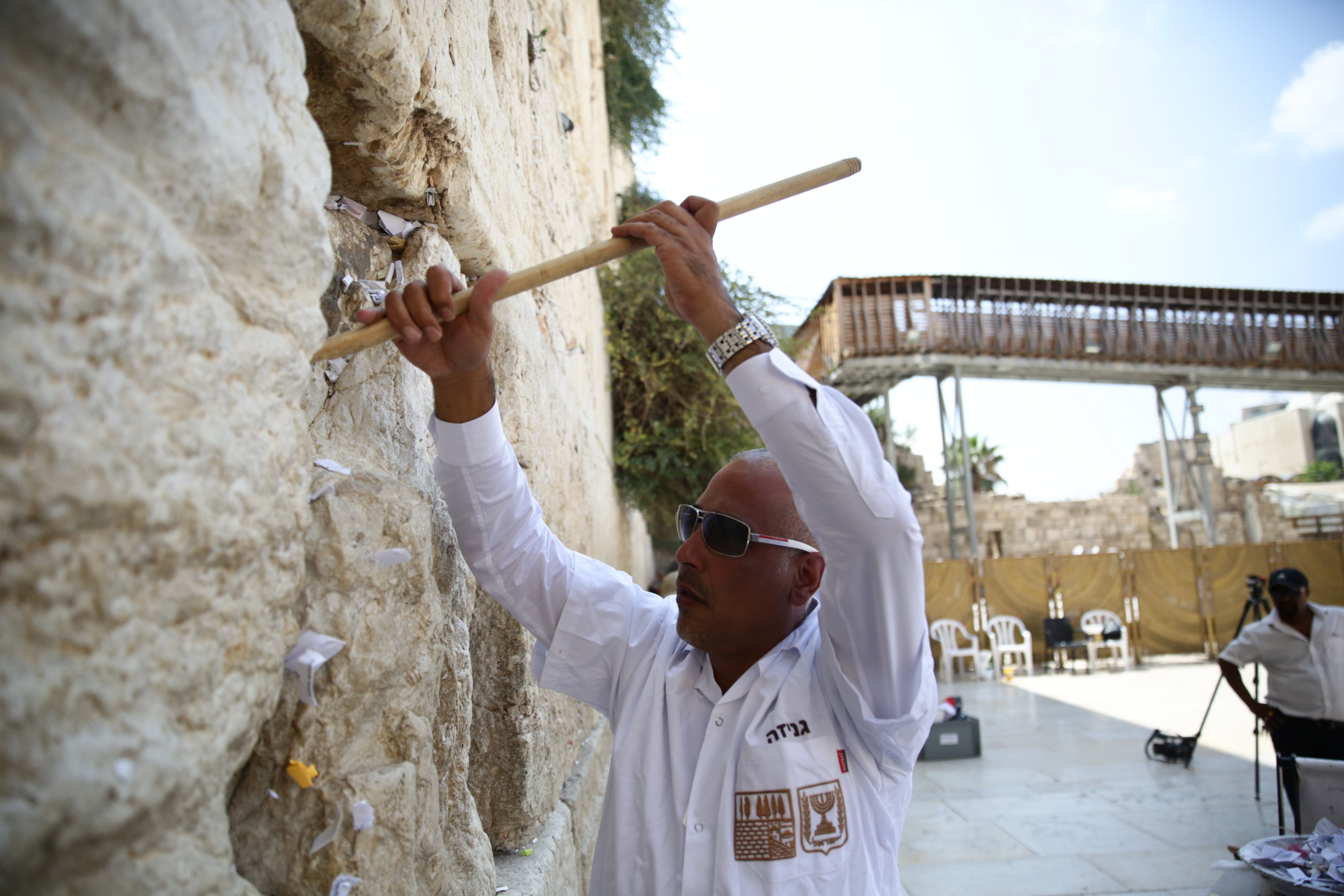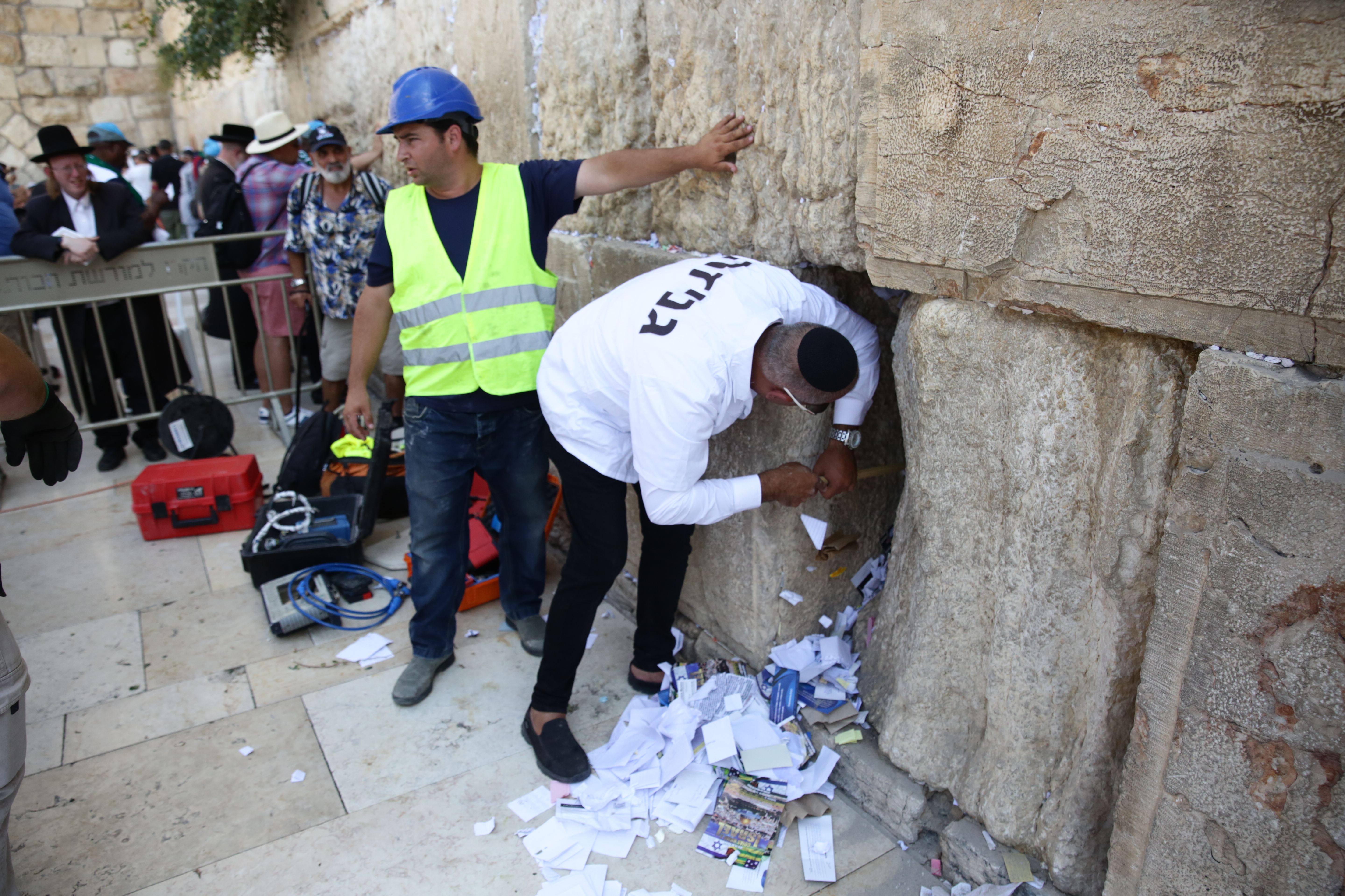 מליוני הפתקים שהוטמנו בכותל פונו היום להר הזיתים שם יטמנו. רב הכותל שמואל רבינוביץ' ניצח על המלאכה עד שפונו כלל פתקי התפילה על ידי מקלות עץ ונבדקה תקינות האבנים • צפו בתמונות (צילום: חיים גולדברג/ כיכר השבת)