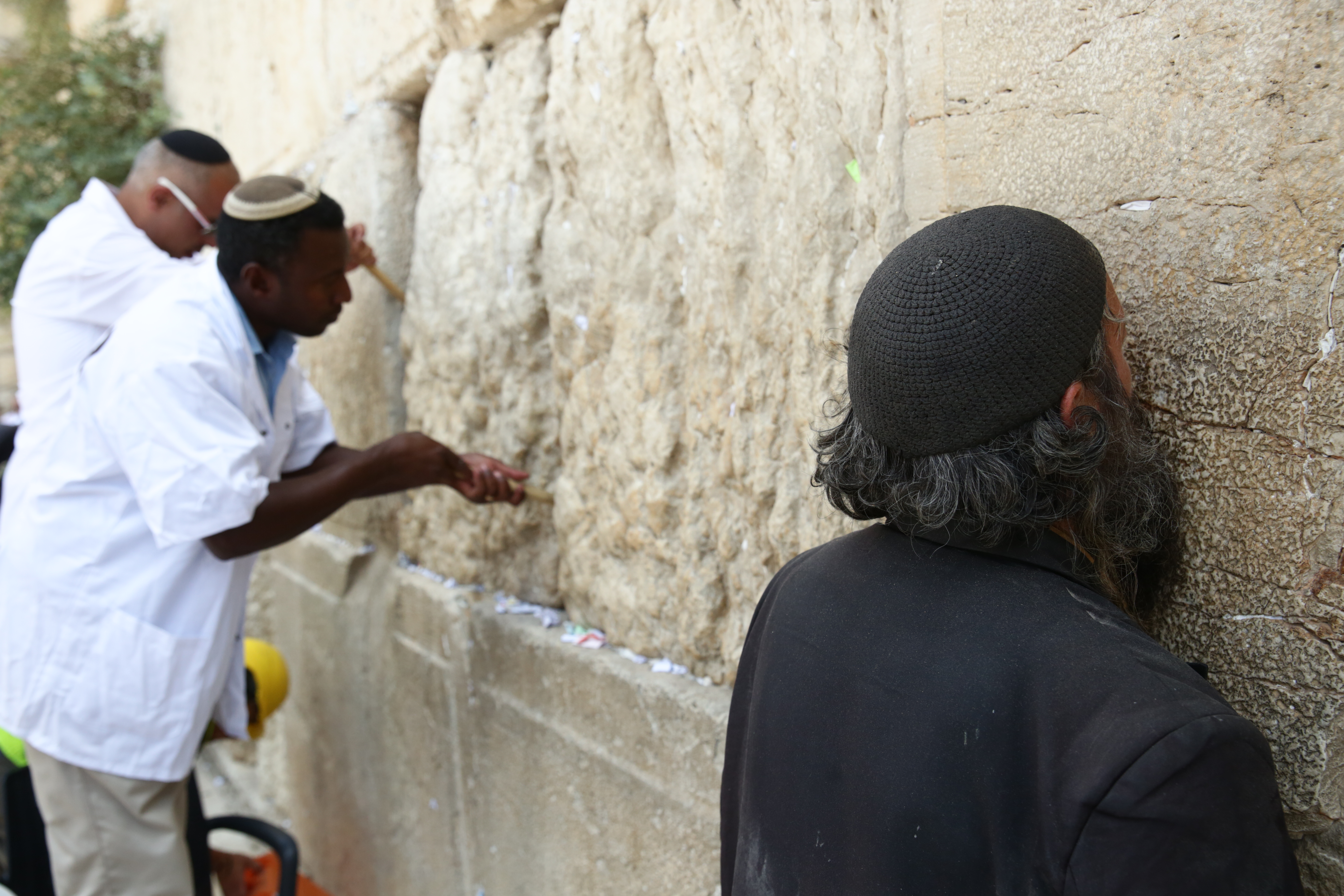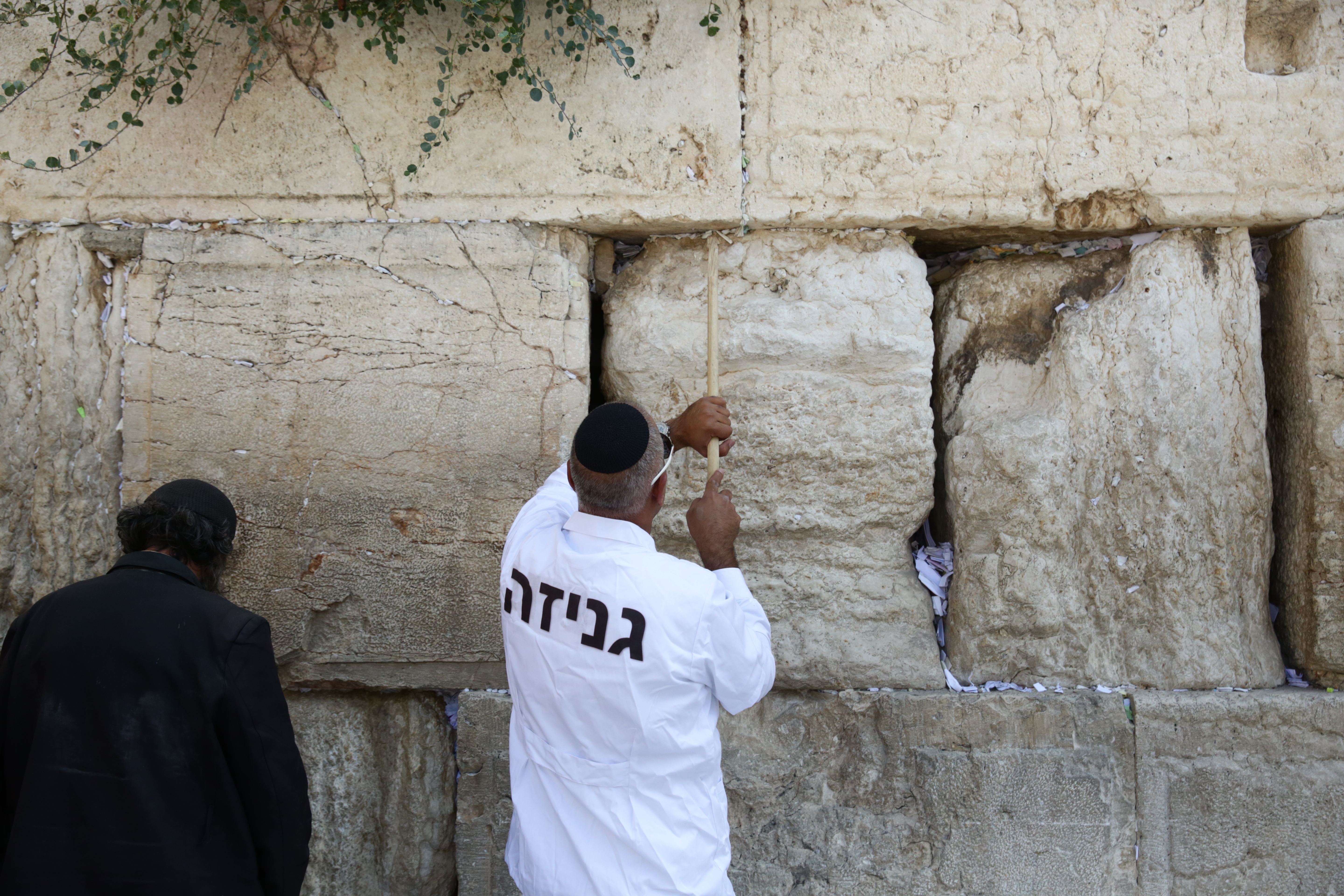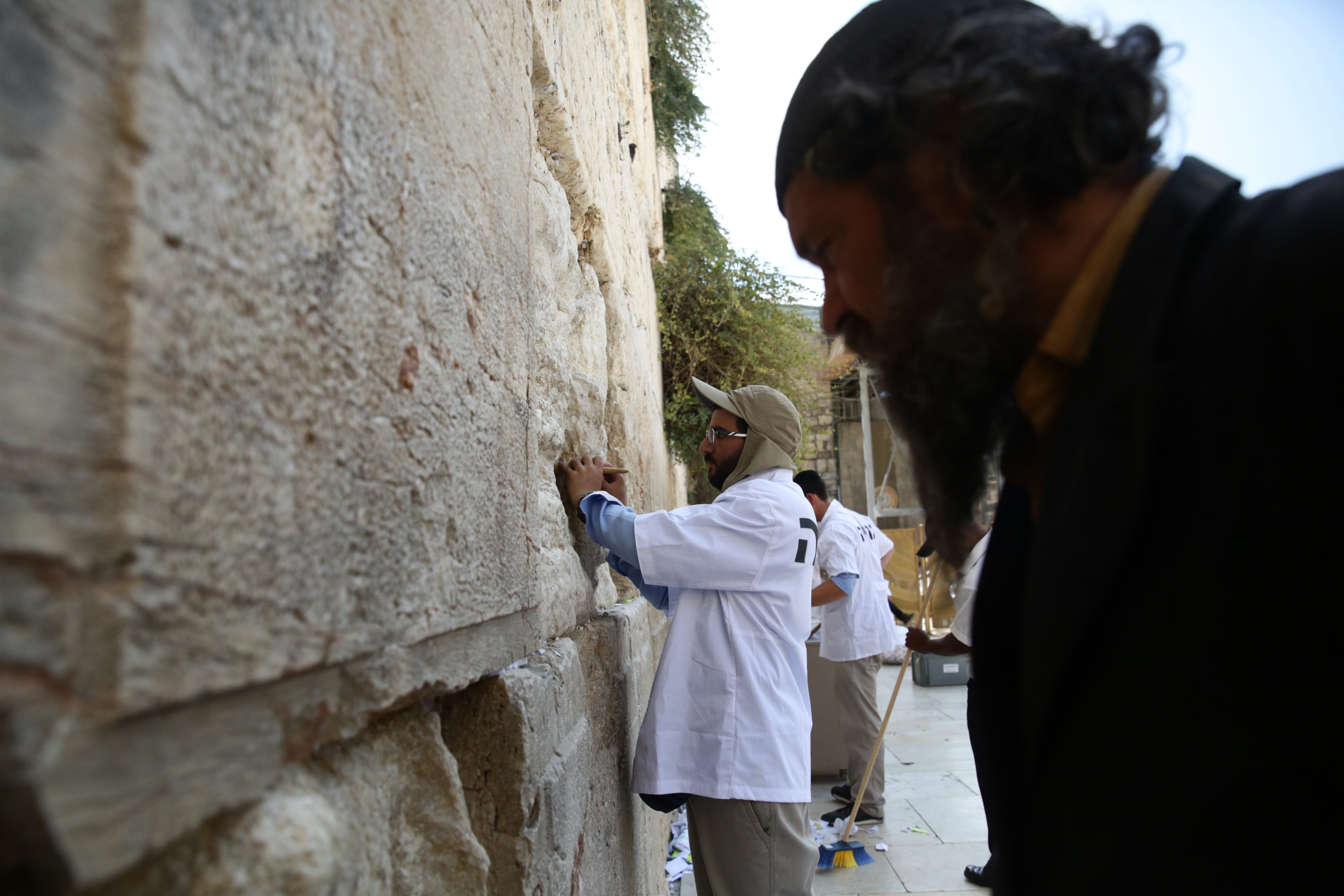 מליוני הפתקים שהוטמנו בכותל פונו היום להר הזיתים שם יטמנו. רב הכותל שמואל רבינוביץ' ניצח על המלאכה עד שפונו כלל פתקי התפילה על ידי מקלות עץ ונבדקה תקינות האבנים • צפו בתמונות (צילום: חיים גולדברג/ כיכר השבת)