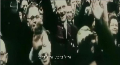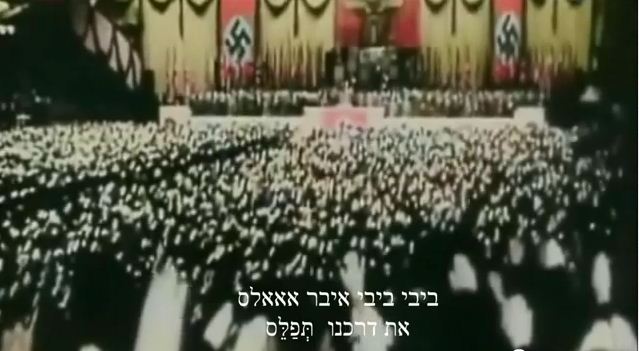 בתגובה מתחיל הקהל לצעוק, על פי הכתוביות: "הייל ביבי" ושר "ביבי איבר אאלס, את שכם וחברון נאכלס" על רקע ההמנון הגרמני דוטשלנד איבר אאלס (גרמניה מעל הכל).