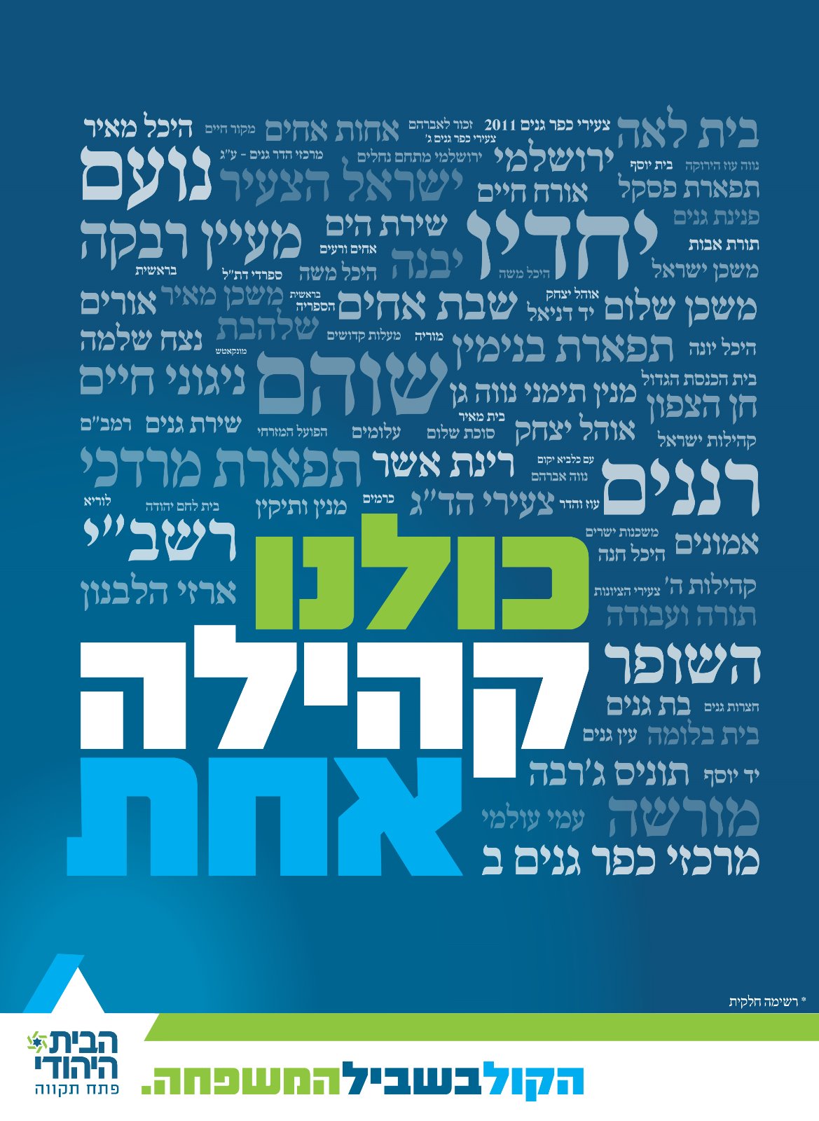 המודעה מכילה את שמות בתי הכנסת בעיר עם הססמה כולנו קהילה אחת, יחד עם הסלוגן, הבית היהודי – הקול בשביל המשפחה.