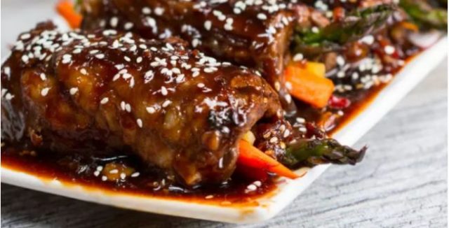 8. בעזרת מברשת, מברישים כל רול בזיגוג החם, משאירים במחבת / גריל עוד דקה ומסירים מהאש. מגישים מיד, חם, ומקשטים בשומשום מעל