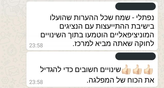בקבוצות ווצאפ סגורות של חברי המפלגה הביע אחד הפעילים תמיכה ישירה ביושב הראש על המהלך, "נפתלי – שמח שכל ההערות שהועלו בישיבת ההתייעצות עם הנציגים המוניציפאליים הוטמעו בתוך השינויים לחוקה שאתה מביא למרכז". פעיל אחר כתב:"👍🏻👍🏻👍🏻שינויים חשובים כדי להגדיל את הכוח של המפלגה".