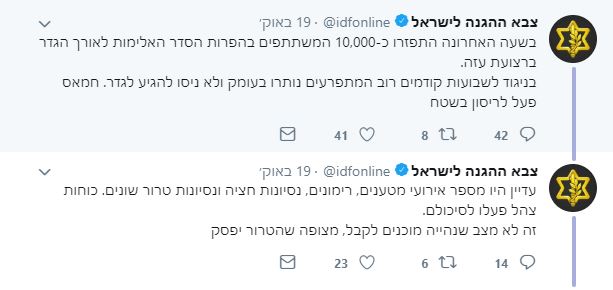 אתמול לאחר כניסת השבת (לא ברור מה הצורך המבצעי בהפעלת טוויטר בשבת), צייץ החשבון הרשמי של צה"ל בטוויטר: "בשעה האחרונה התפזרו כ-10,000 המשתתפים בהפרות הסדר האלימות לאורך הגדר ברצועת עזה. בניגוד לשבועות קודמים רוב המתפרעים נותרו בעומק ולא ניסו להגיע לגדר. חמאס פעל לריסון בשטח".
