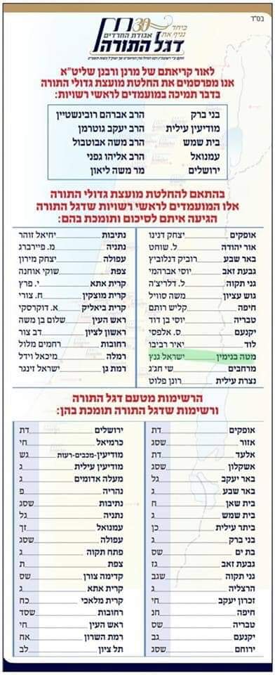 הבוקר (ד') פרסמה אגודת ישראל את רשימת מועמדיה בבחירות ברשויות המקומיות בה מציינת אגודת ישראל מפורשות כי יש לה הסכמים עם המועמדים בהם היא תומכת ובניהם גם שמו של ישראל גנץ.