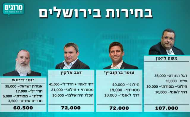 לקראת הבחירות המוניציפליות שייערכו ביום שלישי הקרוב לראשות העיר ירושלים, ולאור ההסכמים שנחתמו בין ציבורים מסויימים למועמדים השונים, מנתונים שהגיעו לידי סרוגים על ידי המטות של המועמדים לראשות העיר- ניתן לראות כמה מצפה כל אחד מהמועמדים לקבל מהמגזרים השונים ולשקף את לפי זה את סיכויוו לרשת את ניר ברקת.