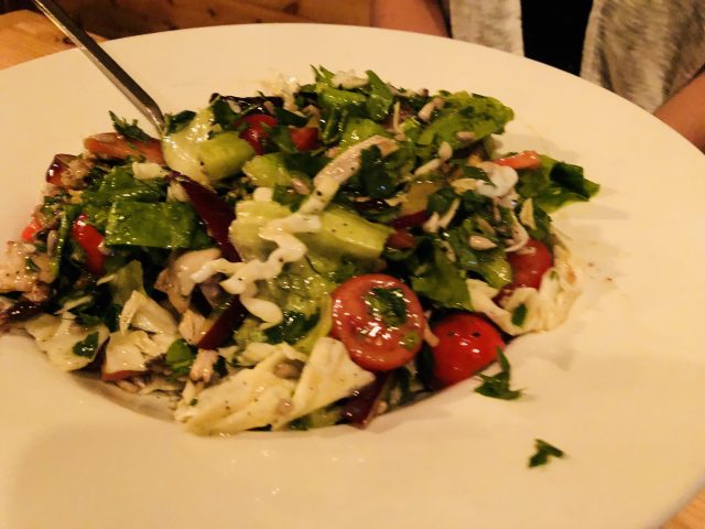 כפתיח קל (תחת הכותרת בתפריט "באמצע.. לא גדול מדיי") לקחנו סלט עוף מעושן (58 ש"ח). מנה מעולה לחובבי בשרים מעושנים! תחילה, רכיבים. בגזרת הירקות – חסה, כרוב, עגבניות שרי וכוסברה.