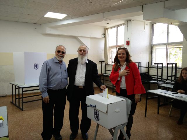 8:45: סגנית ראש העיר ויו"ר הבית היהודי בירושלים חגית משה הגיעה להצביע יחד עם הרב איתן אייזמן ומספר 2 ברשימת הבית היהודי גורי פרוידינגר.