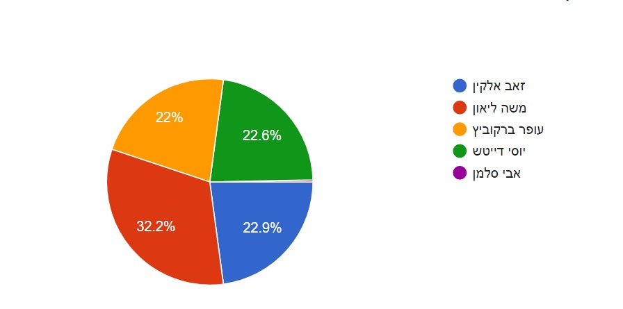 ובעיר האחרונה – בירת ישראל ירושלים, הלכו רוב המצביעים עם משה ליאון שיזכה ברוב הקולות. מעניין לראות כי שאר המועמדים זוכים לכמעט רבע מהקולות, מה שאומר שהגולשים הסרוגים, סבורים כי יוסי דייטש שלא היה מועמד לעלייה לסיבוב שני, יכול להפתיע.