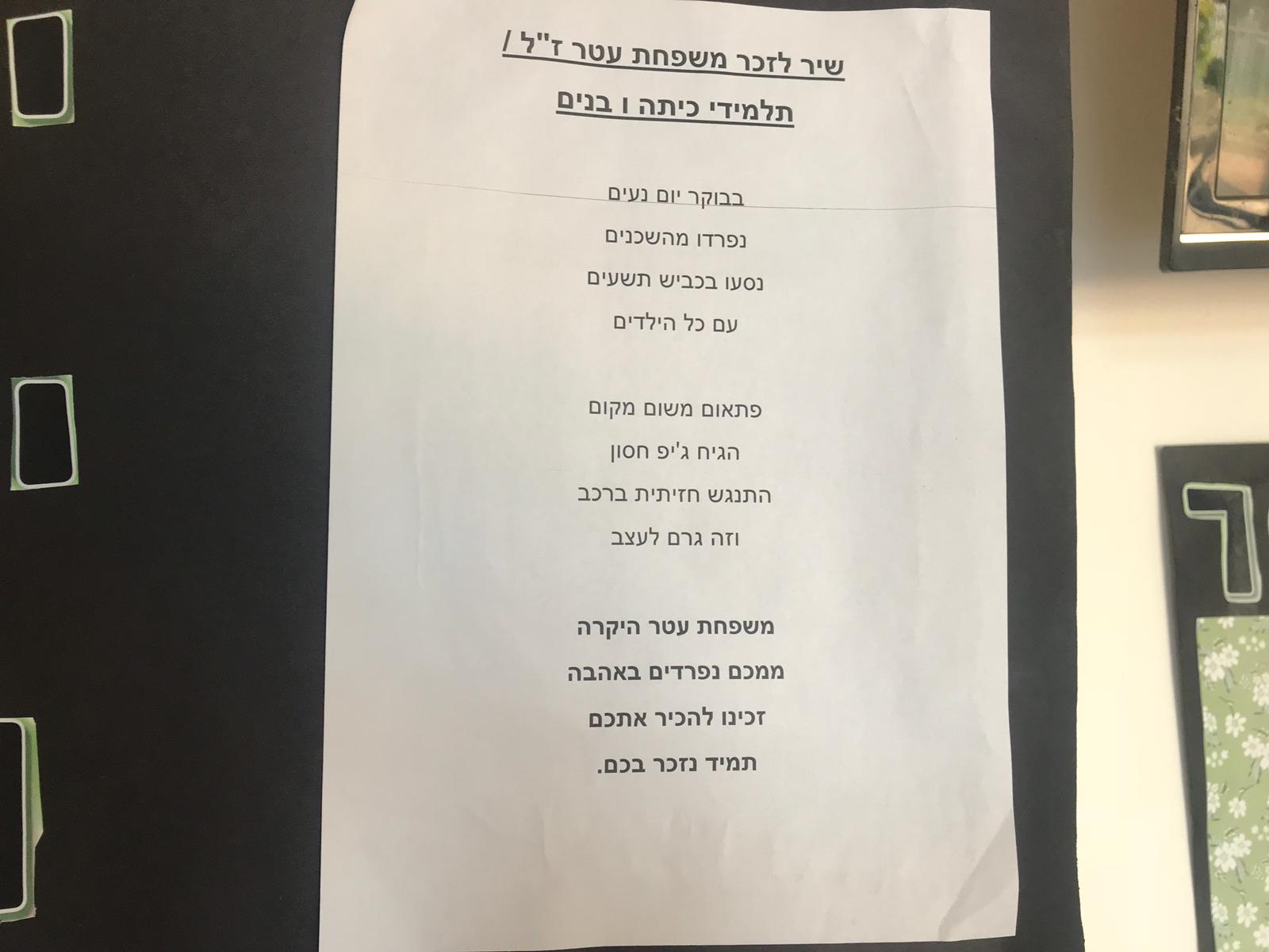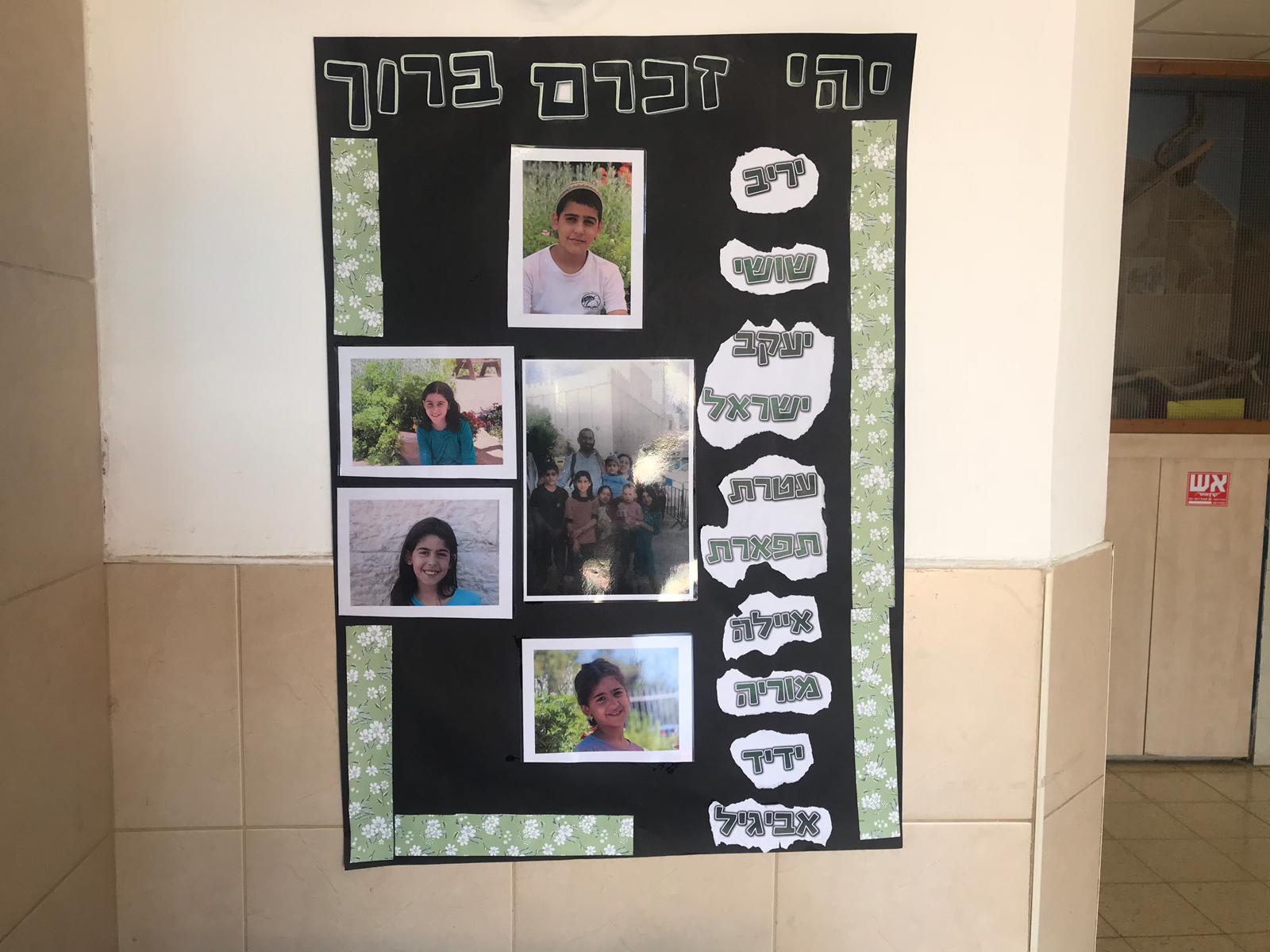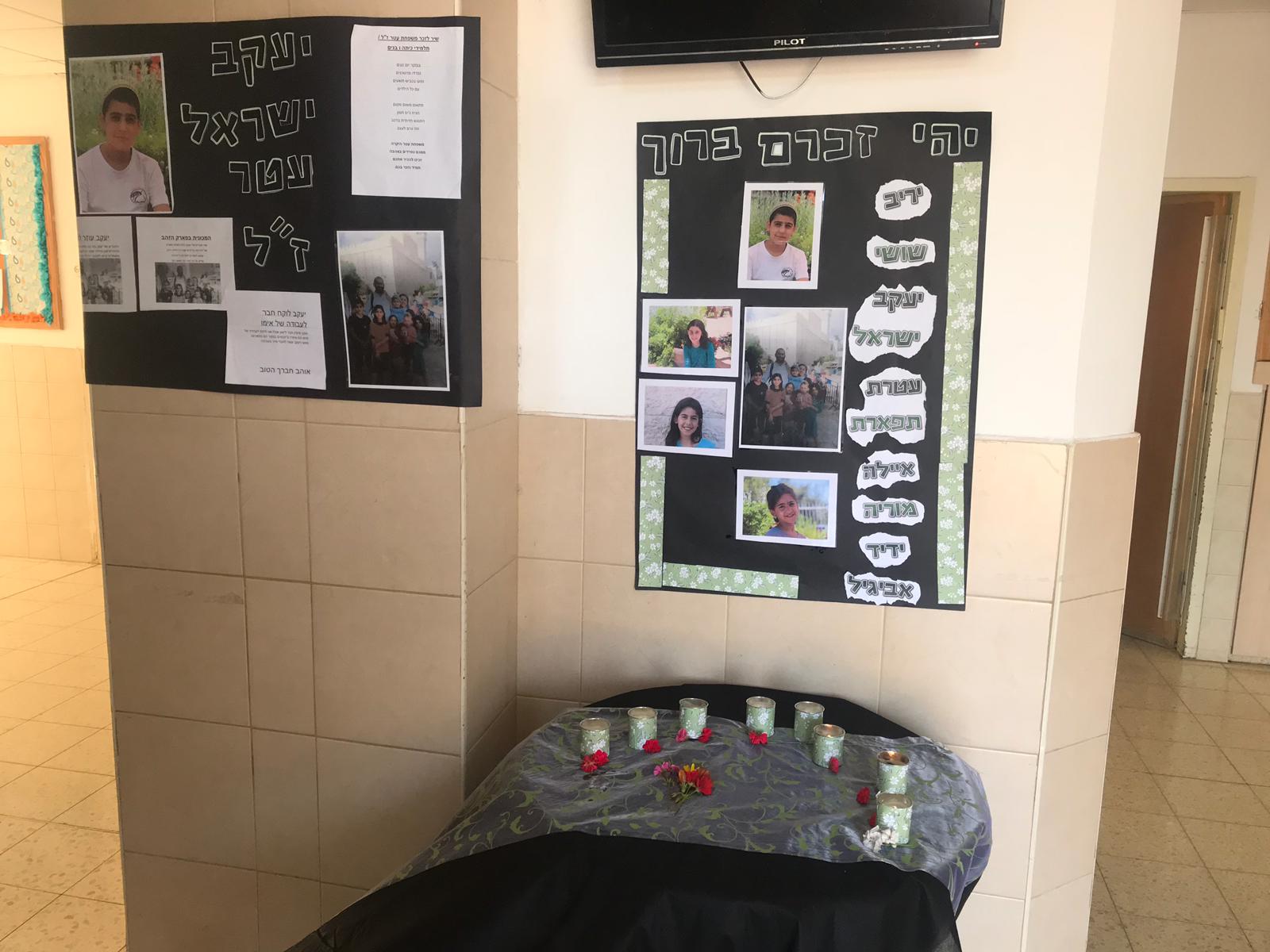 קיר זכרון הוקם הבוקר ועליו דברי הנצחה שכתבו החברות והחברים של יעקב-ישראל שסיים בקיץ האחרון את לימודיו בבית הספר ולזכר שלוש אחיותיו עטרת-תפארת, אילה ומוריה ז״ל.